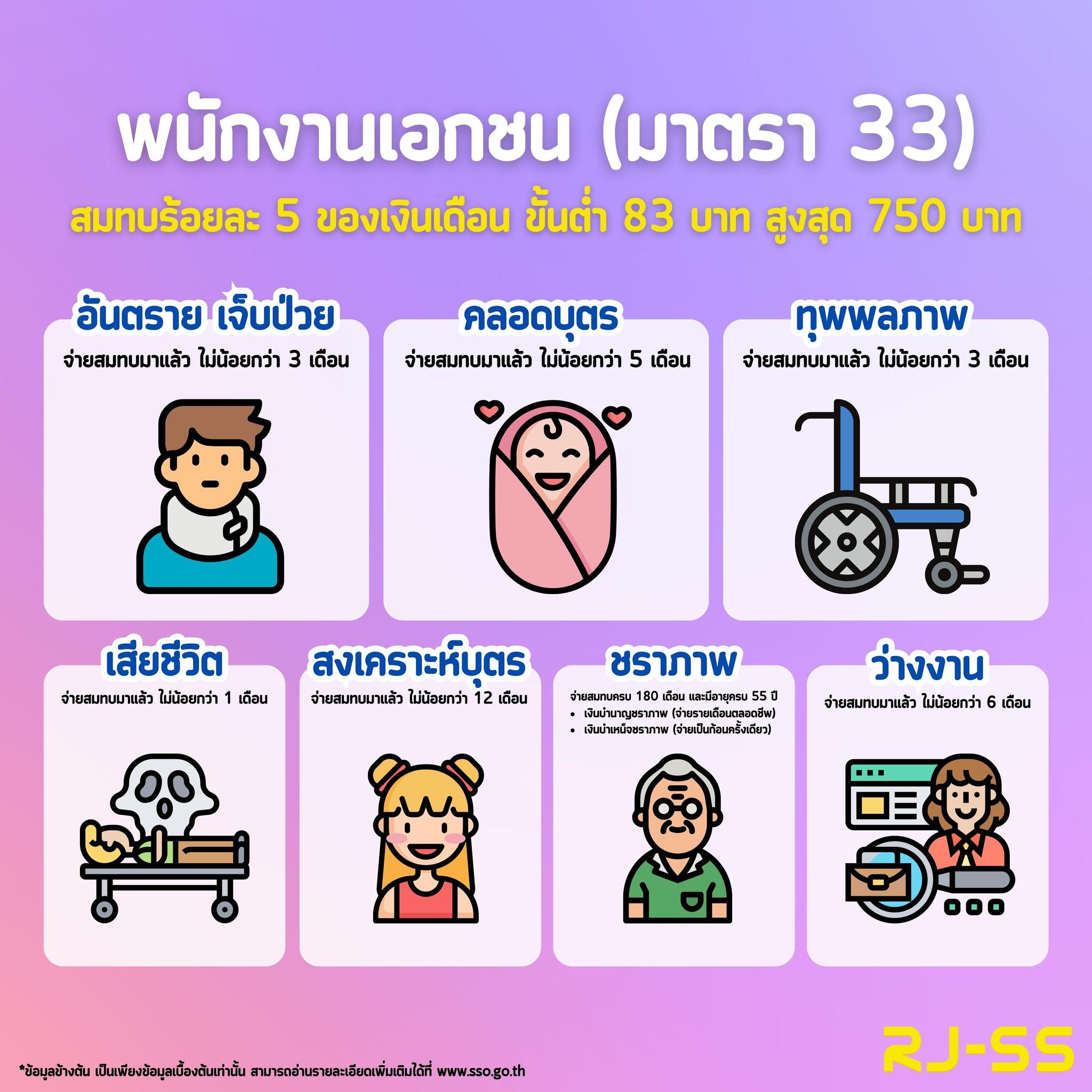 ผู้ประกันตนจ่ายเงินสมทบเดือนละ 5% ของค่าจ้าง สูงสุดไม่เกิน 750 บาท/เดือน คุ้มครอง 7 กรณี ดังนี้